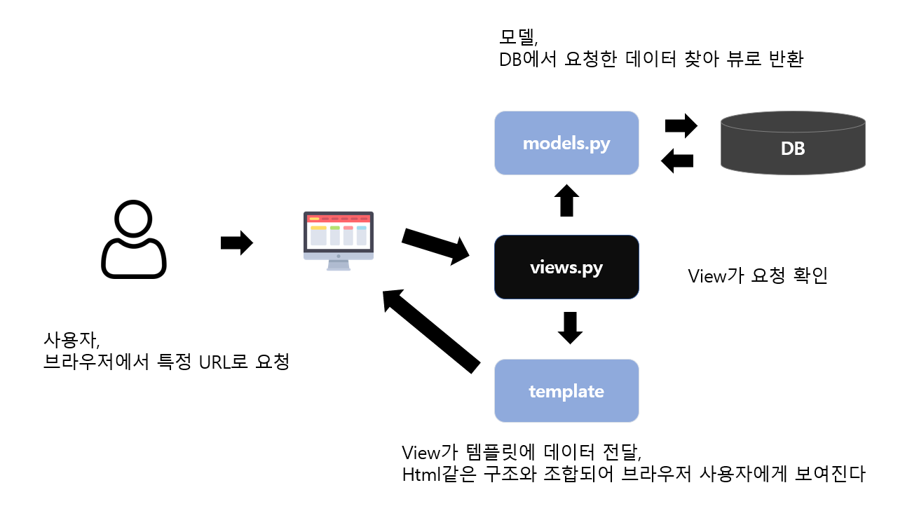 (html파일을 사용할 때) 장고는 뷰에서 로직을 처리한 후, html파일을 context(템플릿에서 쓰이는 변수명과 파이썬 객체를 연결하는 사전형 값)와 함께 렌더링하는데, 이 때 렌더링한 html파일이 템플릿이다.