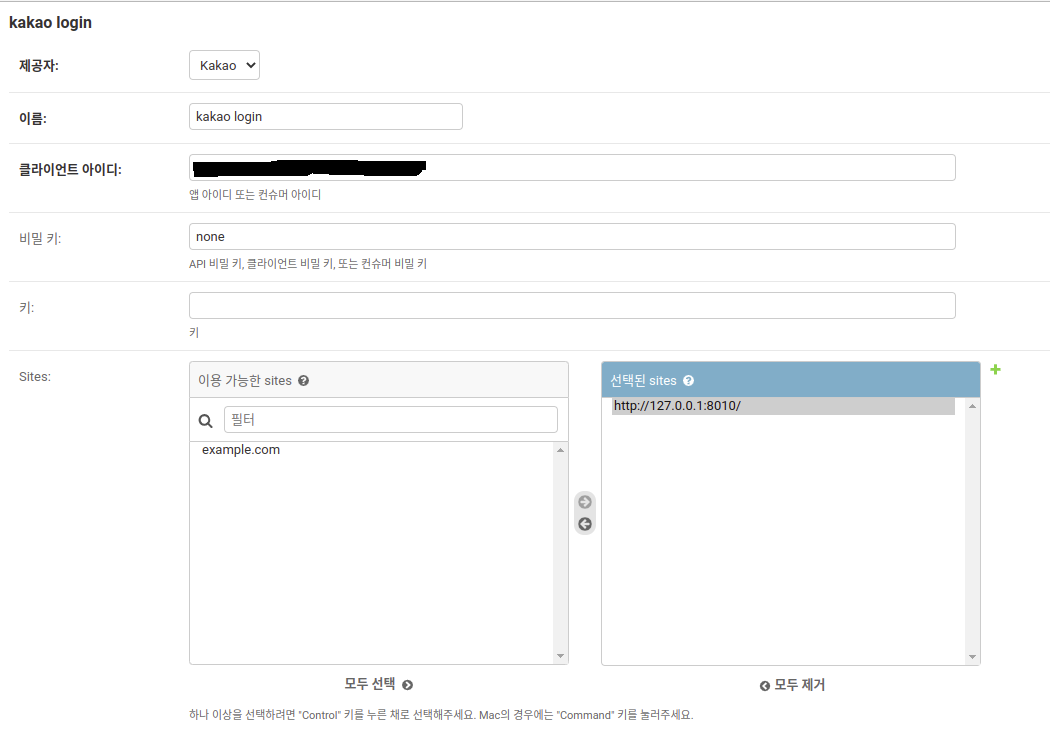 7. 클라이언트 아이디에 REST API키 입력하기. 카카오 로그인은 비밀키가 없어서 none으로 해줘도 된다.