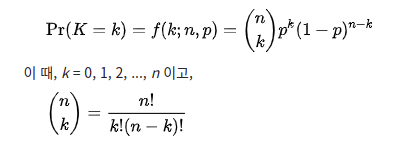 n번 시행 중 k번 성공할 확률은 확률 질량 함수로 주어진다: